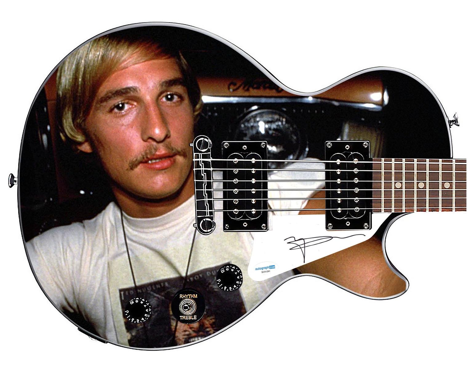Immerse yourself in the nostalgia of iconic cinema and the timeless allure of rock 'n' roll with the Matthew McConaughey Autographed Custom 1/1 Dazed & Confused Epiphone Graphics Guitar. This extraordinary instrument pays homage to the cult classic film, adorned with custom graphics that capture the rebellious spirit of the '70s. Each Graphics Guitar in this exclusive series is a unique masterpiece, meticulously crafted and customized to evoke the essence of Dazed & Confused. Adding to its allure, the Graphics Guitar bears the distinctive signature of Matthew McConaughey, penned in bold black felt tip marker on the custom repurposed pickguard. It's more than just a Graphics Guitar; it's a piece of cinematic history, a symbol of youthful rebellion, and a celebration of the enduring legacy of one of Hollywood's most beloved actors. Matthew McConaughey's career is a testament to his versatility and charisma, marked by memorable performances that have captivated audiences for decades. From his breakout role in Dazed & Confused to his Academy Award-winning turn in Dallas Buyers Club, McConaughey has consistently defied expectations and left an indelible mark on the silver screen. With each signature, this Graphics Guitar becomes a cherished memento of his iconic portrayal of Wooderson, the laid-back rebel with a penchant for rock music. It's a tribute to McConaughey's enduring appeal and the enduring legacy of Dazed & Confused, a film that continues to resonate with audiences of all generations. In the world of collectibles, autographed Graphics Guitars hold a special place of honor, combining the passion of music enthusiasts with the admiration of celebrity fans. As the demand for authentic memorabilia grows, owning a one-of-a-kind piece like the Matthew McConaughey Autographed Dazed & Confused Epiphone Graphics Guitar becomes not only a privilege but also a savvy investment. With only one Graphics Guitar in existence, signed by McConaughey himself in bold black felt tip marker, its rarity ensures its status as a highly sought-after collectible. As the years pass, the scarcity of such treasures only enhances their value, making them prized possessions for collectors and fans alike.