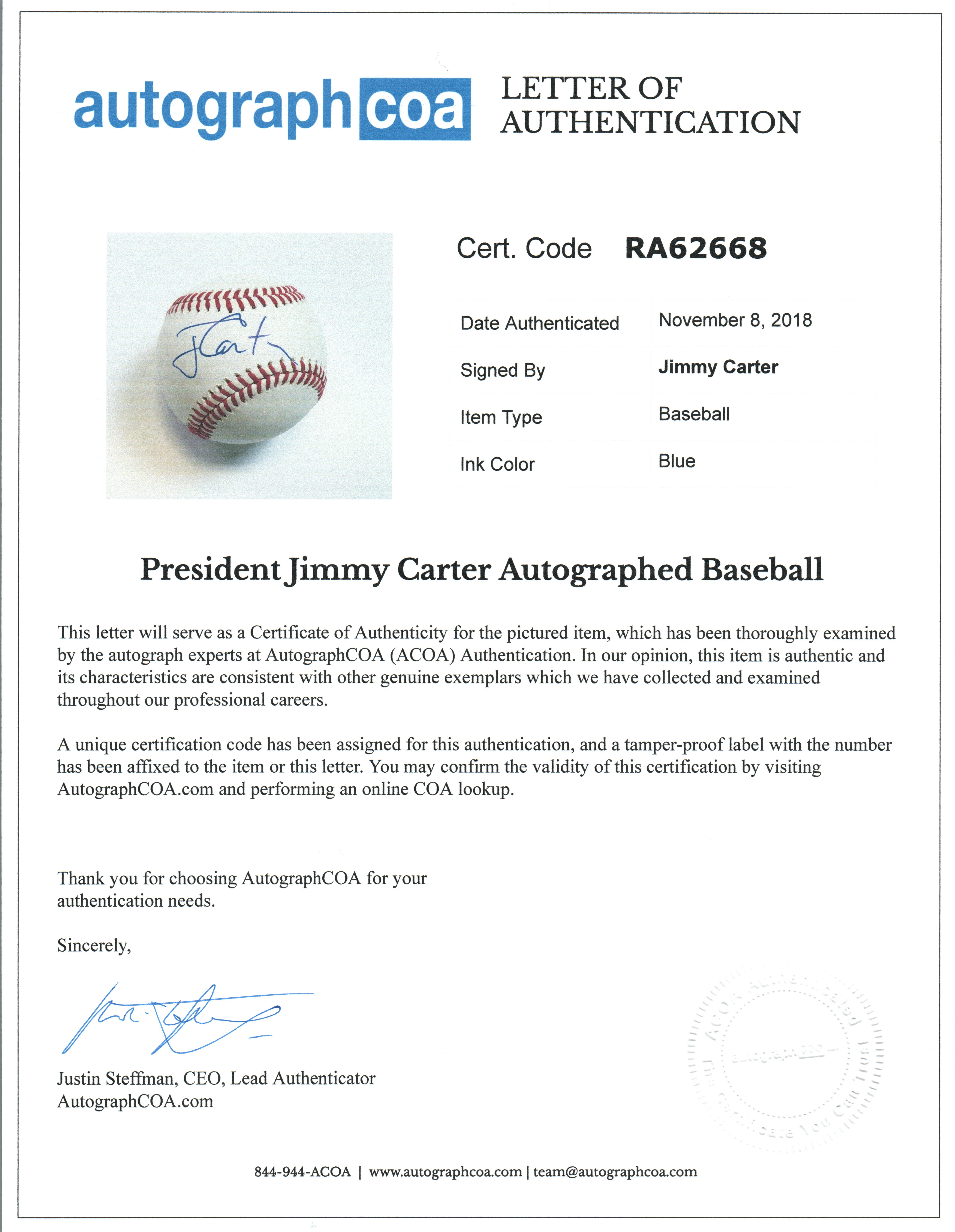 Verification of this item's authenticity can be confirmed by visiting the AutographCOA.com web site and doing a certification lookup for this item. The ACOA certification number for this item is: RA62668